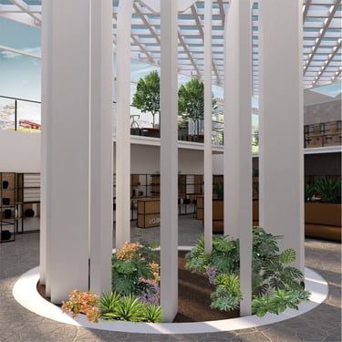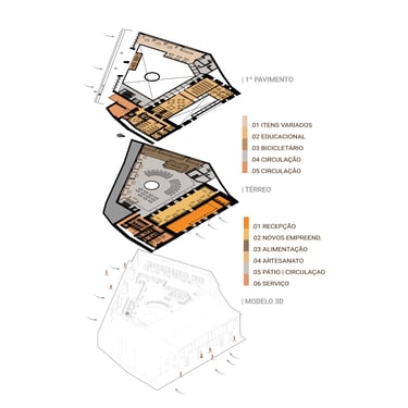 Ao redor, a área externa acompanha esse movimento centrípeto e serve de transição entre a cidade e o interior do edifício. O percurso conduz o visitante para em um espaço onde a história e os saberes populares são preservados e reativados. A arquitetura cria, assim, um ambiente contínuo e simbólico, onde o vazio central não é ausência, mas origem e destino.